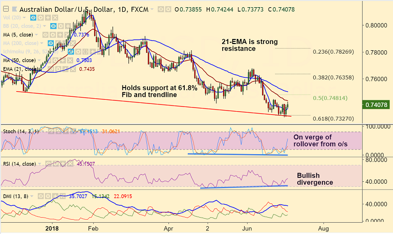 Support levels - 0.7376 (5-DMA), 0.7327 (61.8% Fib), 0.73