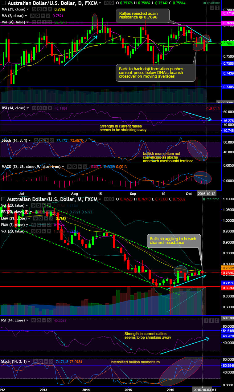 Consequently, although today’s rallies look quite attractive, we could foresee the upside potential up to the next strong resistance at 0.7596 mark (i.e. 21DMA), which means upward travel of another 20-30 pips maximum can be possible as we see the shrinking buying momentum on leading oscillators.