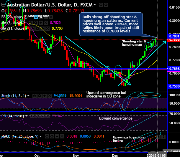 Shooting star & hanging man patterns have occurred at 0.7801 and 0.7834 levels. Bulls shrug-off these bearish patterns, the current prices well above 7DMAs, but previous rallies seem to be little edgy at a stiff resistance of 0.7880 levels (refer daily chart).