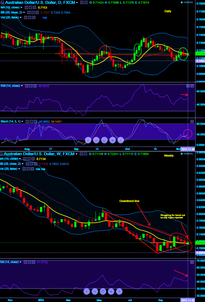 As shown on the weekly charts, swings have formed descending triangle but it has not been able to break and hold the levels of 0.7175 (downtrend line) quite a lot times in the recent weeks, and same does the support levels at 0.7140 on southwards, you can observe how the price behavior of this pair on either side after breaching this level in the recent historical evidences (see circled areas on daily charts).
