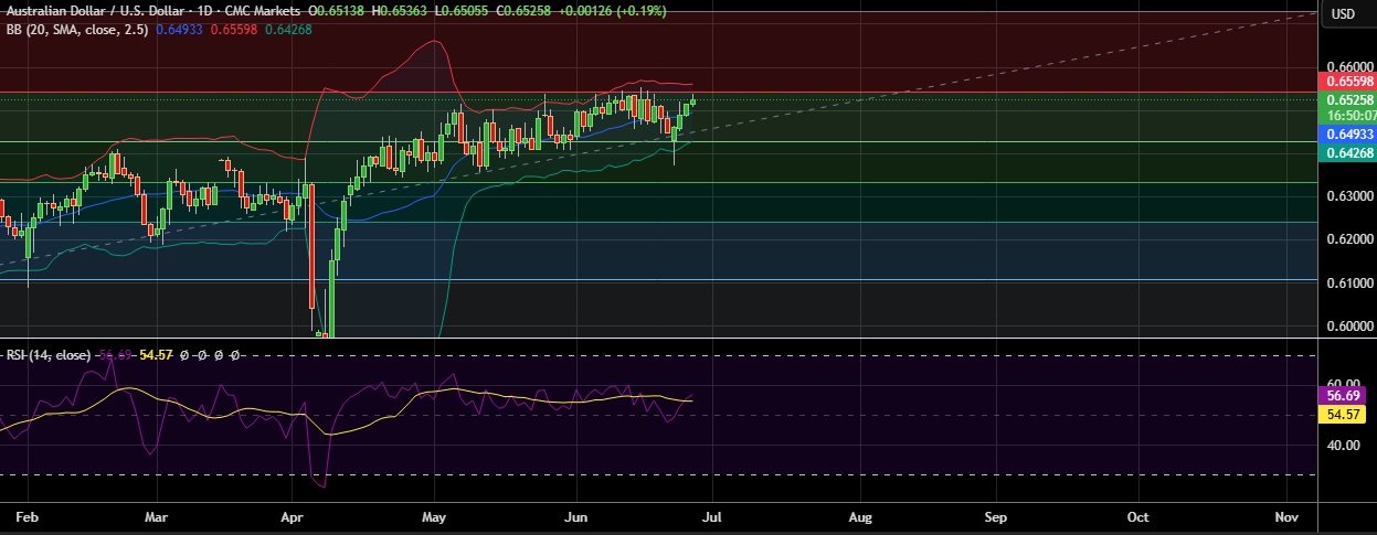 • Immediate resistance is located at 0.6542(23.6%fib), any close above will push the pair towards 0.6556(Higher BB).