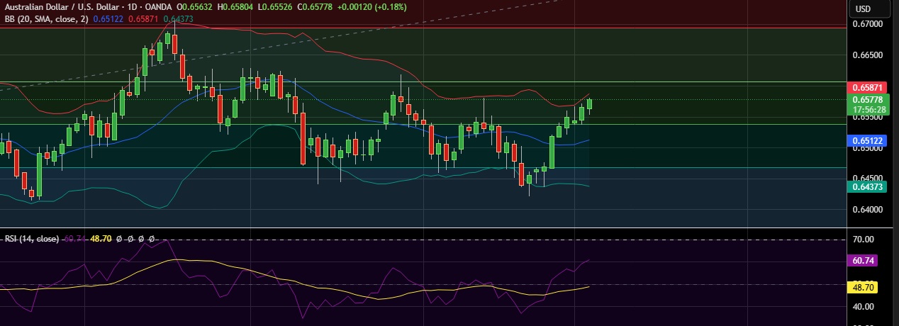 • Immediate resistance is located at 0.6586(Higher BB), any close above will push the pair towards 0.6606(38.2%fib).