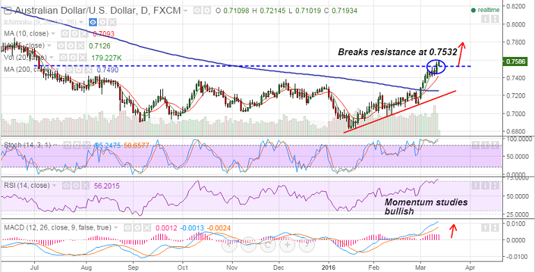 - The pair has broken strong resistance at 0.7532 (July 6th highs) and major moving averages are biased higher.