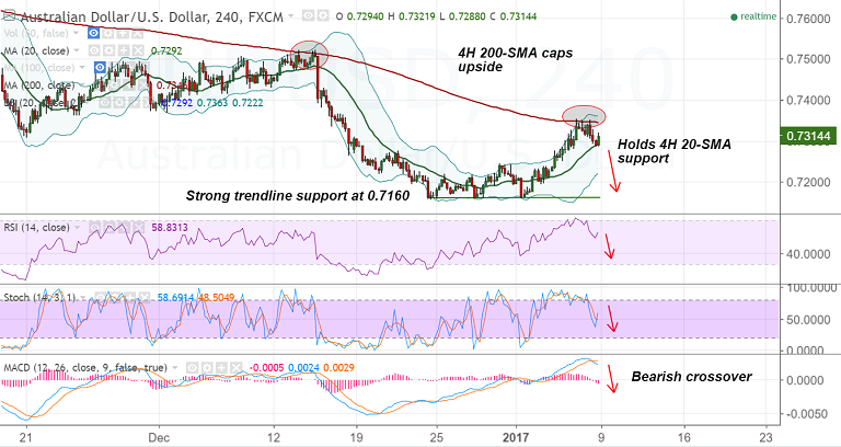 - Support: 0.7305 (23.6% Fib), 0.7292 (4H 20-SMA), 0.7264 (20-DMA)