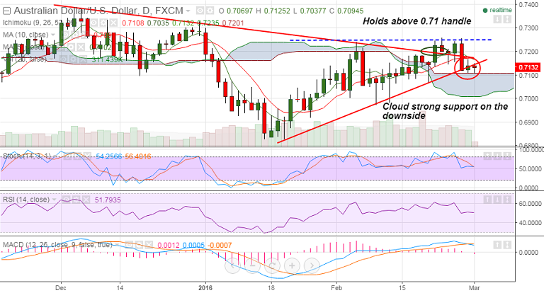 - Cloud-top at 0.7106 is seen as strong support on the downside, and the pair has held support, weakness seen only on breaks below.