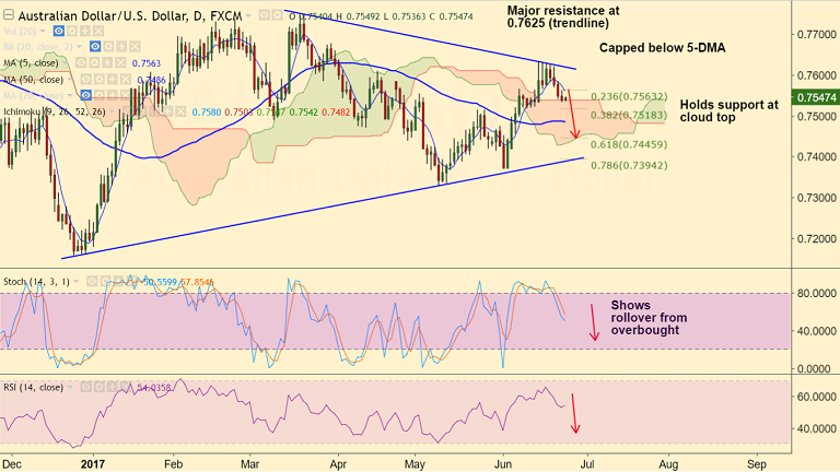 Resistance levels - 0.7563 (converged 5-DMA and 23.6% Fib), 0.76, 0.7625 (trendline)