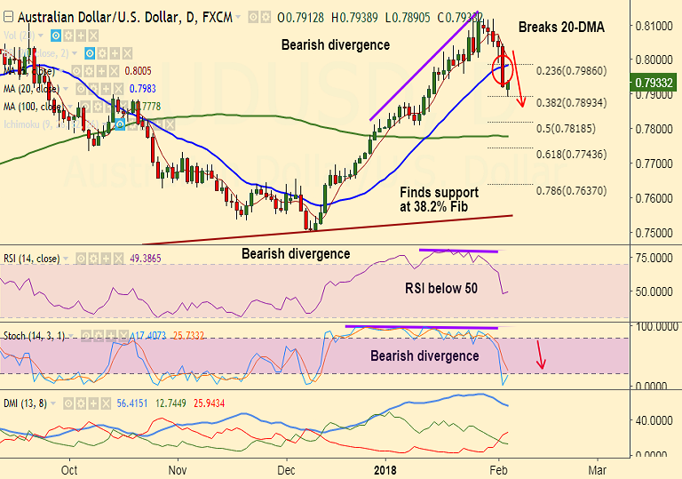 - AUD/USD broke below 20-DMA at 0.7980, hit 4-week low at 0.7890, bias remains bearish.