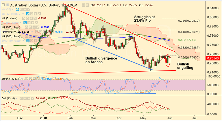Support levels - 0.7549 (5-DMA), 0.75, 0.7447 (May 15, 16 low), 0.7420 (trendline)
