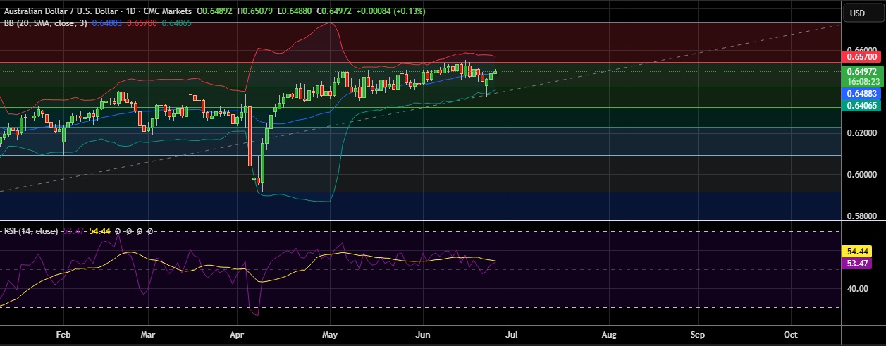 • AUD/USD held firm on Wednesday as improved risk appetite stemming from the ongoing Israel-Iran ceasefire offset the impact of weaker-than-expected Australian inflation figures.