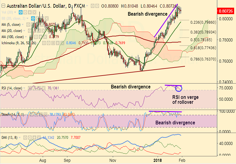- AUD/USD in the red for the 3rd straight session, bearish divergence on RSI and Stochs keep scope for downside.