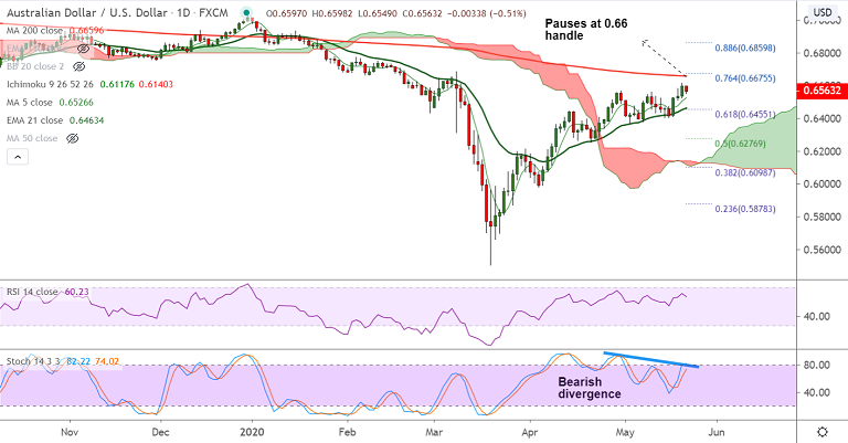 The pair finds stiff resistance at 200-DMA at 0.6659. 'Bearish divergence' on Stochs could drag prices lower.