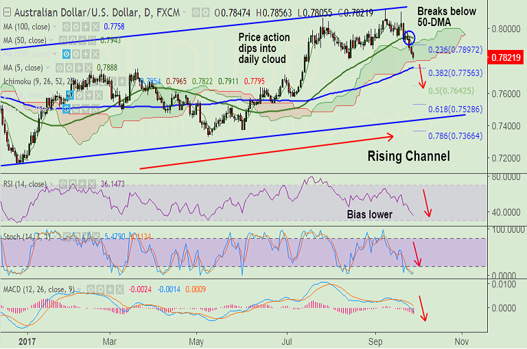 Support levels - 0.7795 (cloud base), 0.7777 (weekly 20-SMA), 0.7758 (nearly converged 50-DMA and 38.2% Fib retrace of 0.71599 to 0.81250 rally)