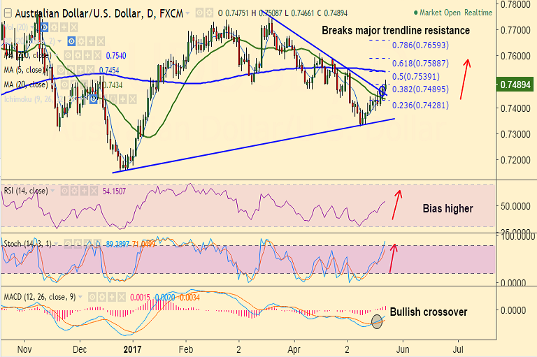 Resistance levels - 0.75 (psychological level), 0.7540 (200-DMA), 0.7588 (61.8% Fib)