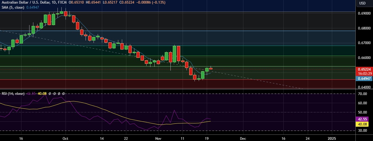 • Support is seen at 0.6494 (5SMA) and break below could take the pair towards 0.6445(23.6%fib).
