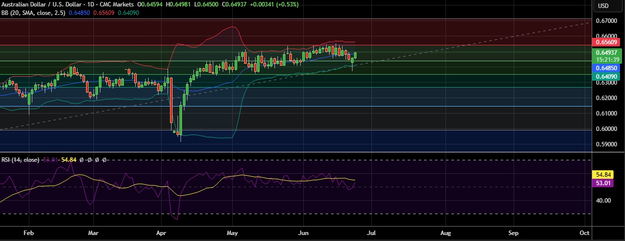 • Support is seen at 0.6436(38.2%fib) and break below could take the pair towards 0.6414(Lower BB).