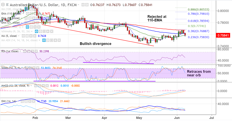 - AUD/USD faltered at 110-EMA, has slipped below 55-EMA at 0.7617, trades below 0.76 handle.