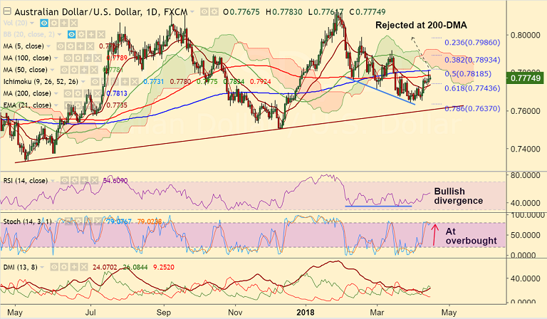 Resistance levels - 0.7781 (50-DMA), 0.7789 (100-DMA), 0.78, 0.7813 (200-DMA)