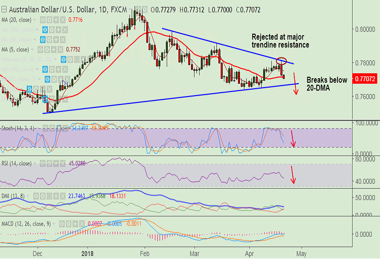 - The major has slipped below 20-DMA at 0.7717 and we see scope for further weakness.