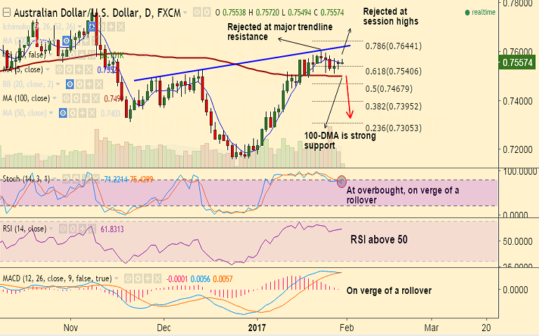 - AUD/USD hovers around 5-DMA at 0.7552 after rejection at session highs at 0.7572.