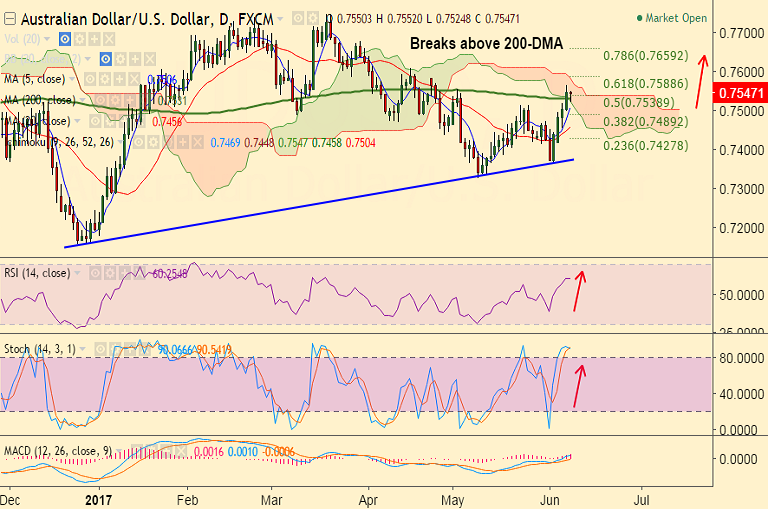 - Technically, the pair has closed above 200-DMA at 0.7531 on Wednesday's trade, raising scope for upside.