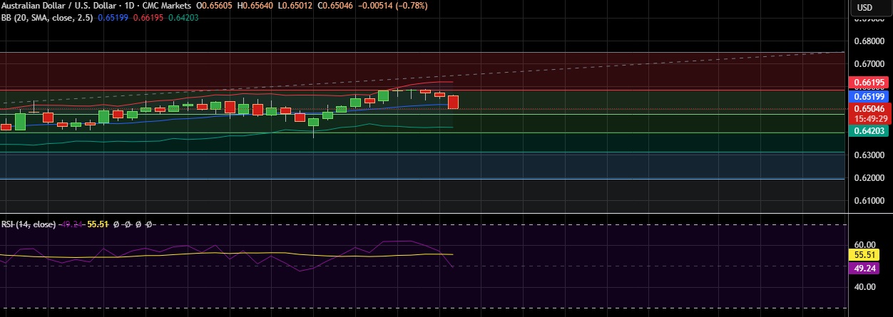 • Support is seen at 0.64821(38.2%fib) and break below could take the pair towards 0.6422(Lower BB).