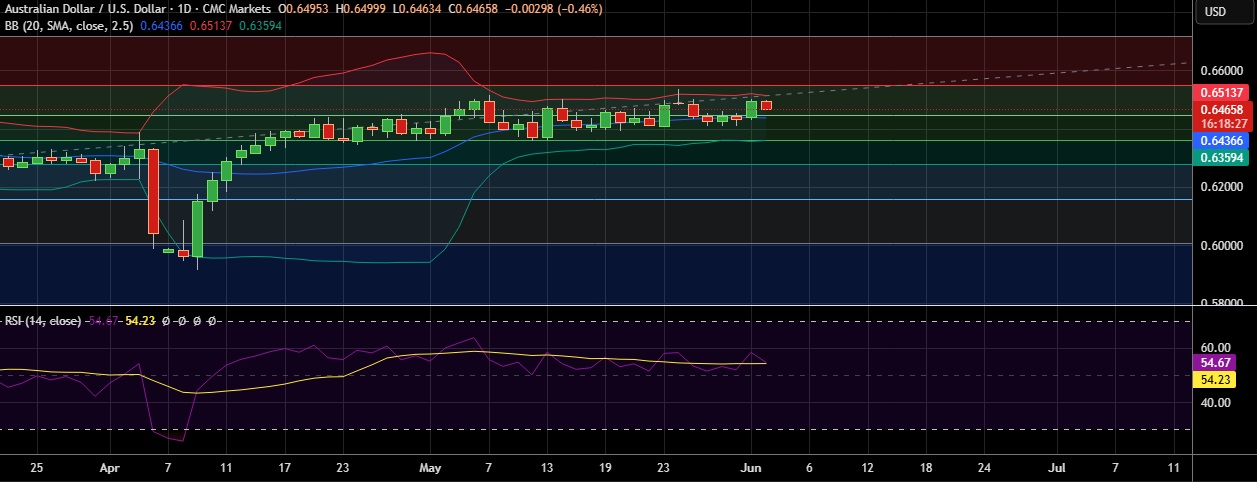 • Immediate resistance is located at 0.6515(Higher BB), any close above will push the pair towards 0.6549(23.6%fib).