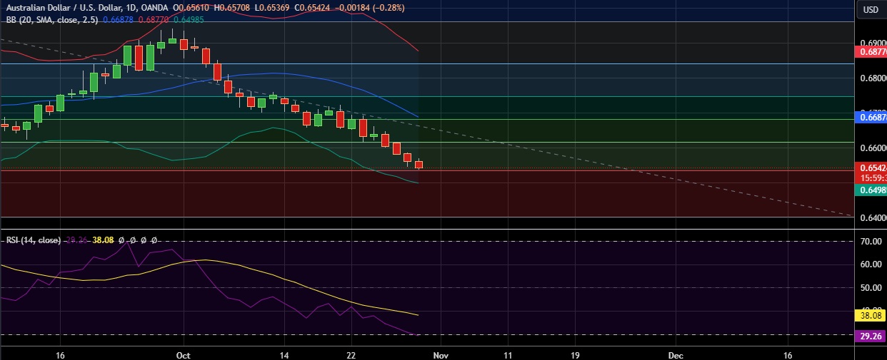 • Support is seen at 0.6535(23.6%fib) and break below could take the pair towards 0.6500 (Psychological level).