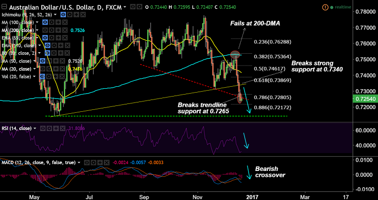 - The pair has broken major trendline support at 0.7265 and trades with a bearish bias.