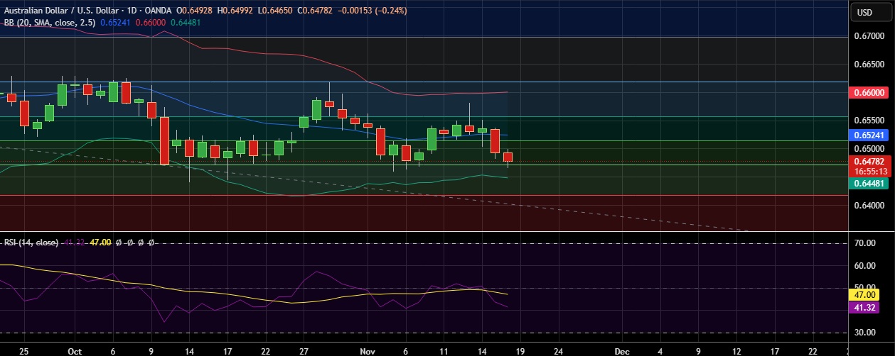 • Support is seen at 0.6451(Lower BB) and break below could take the pair towards 0.6420 (23.6%fib).