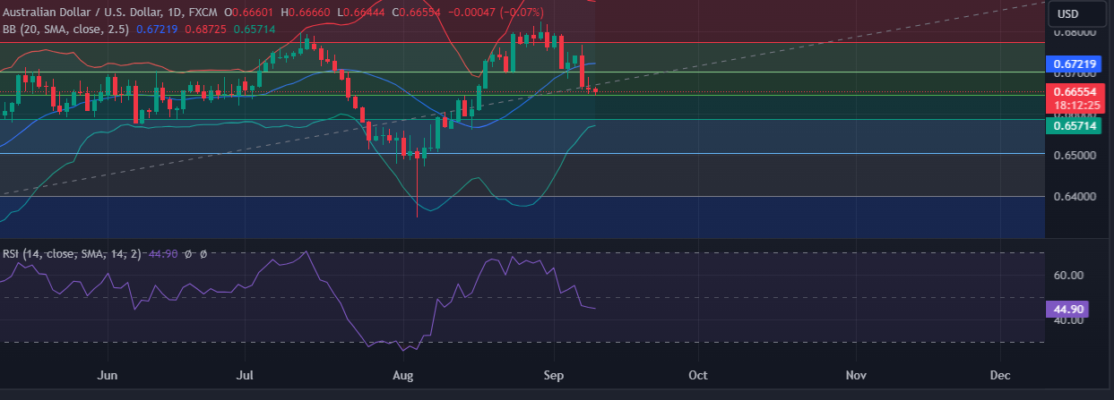 • At GMT 02:34, the pair was down at 0.10 percent at 0.6653 , having touched day low at 0.6648 earlier in the day.
