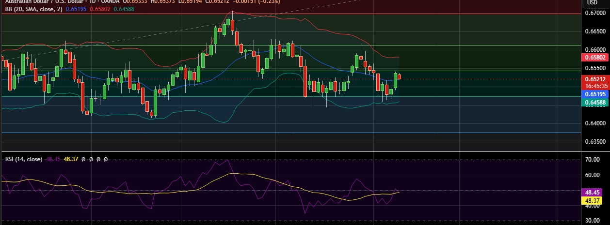• Support is seen at 0.6473 (61.8%fib) and break below could take the pair towards 0.6460(Lower BB).