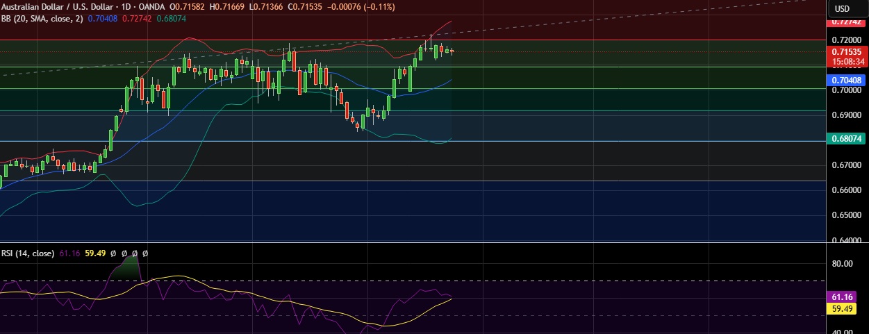 • Immediate resistance is located at 0.7197(23.6fib%), any close above will push the pair towards 0.7255(Higher BB).