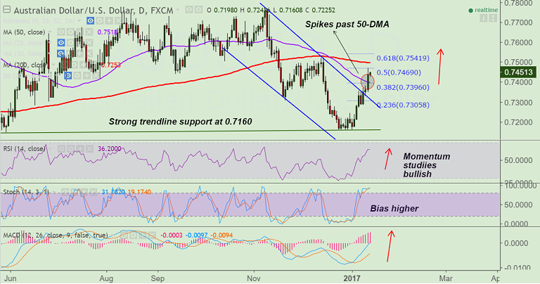 Support levels - 0.7429 (session low), 0.74, 0.7397 (50-DMA), 0.7381 (5-DMA), 0.73, 0.7288 (double bottom Jan 6th & 9th)