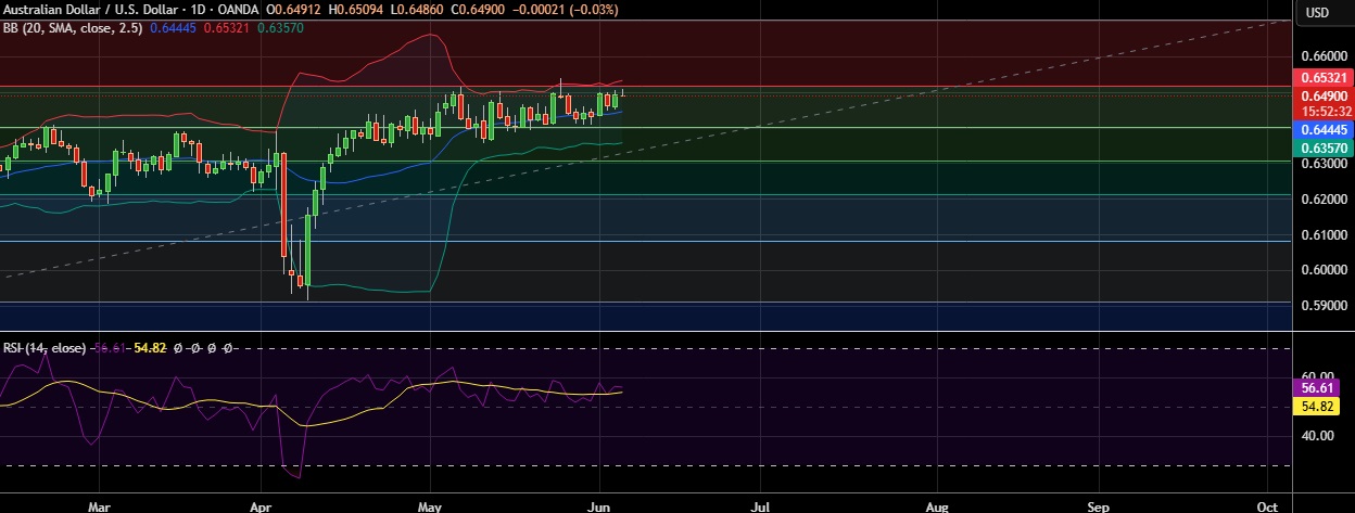 • Immediate resistance is located at 0.6502(23.6%fib), any close above will push the pair towards 0.6513(Higher BB).