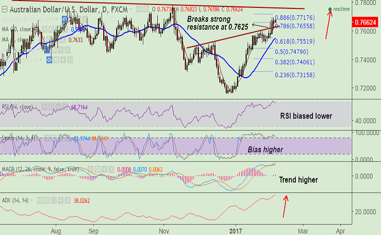 Support levels - 0.7644 (78.6% Fib), 0.7633 (5-DMA), 0.7577 (Feb 2 low)
