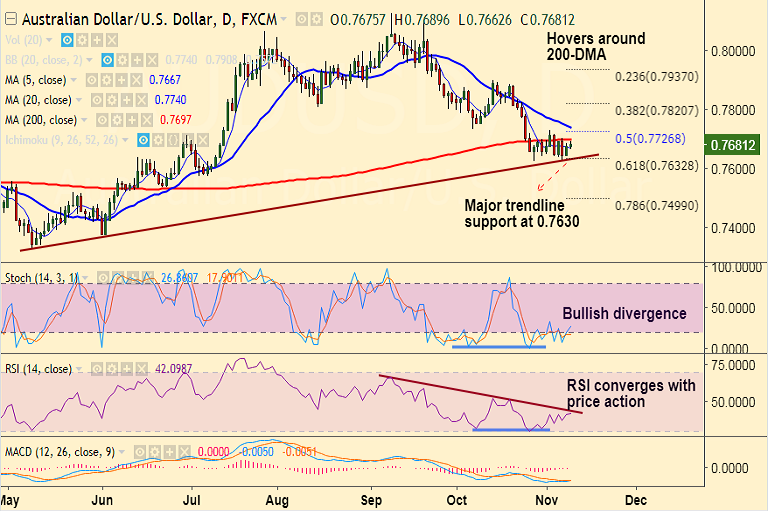 Support levels - 0.7666 (5-DMA), 0.7635 (trendline), 0.7625 (Oct 27 low), 0.7571 (July 5 low)