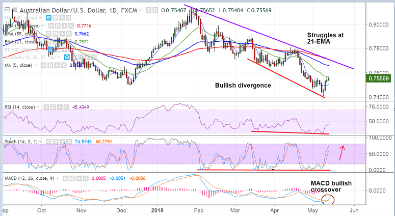 - The pair is struggling at 21-EMA at 0.7571 and decisive break above could see further upside.