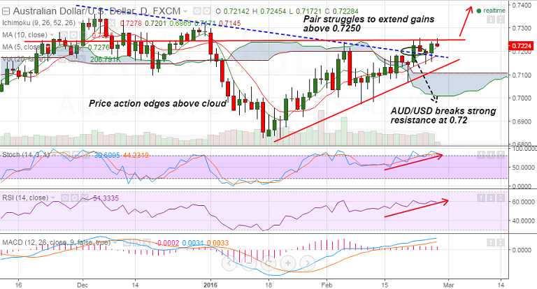 AUD/USD has broken strong resistance at 0.72 levels, but the pair is strugling to extend gains beyond 0.7250.
