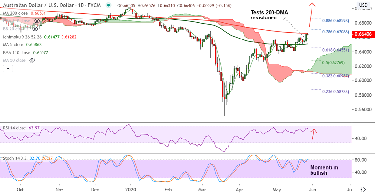 AUD/USD is testing major resistance at 200-DMA at 0.6656. Decisive break above will fuel further gains in the pair.