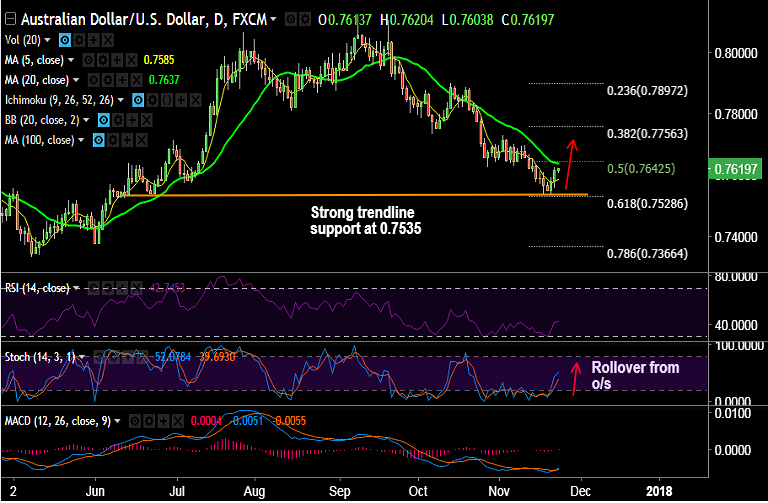 Support levels - 0.7585 (5-DMA), 0.7535 (double bottom June 22 and Nov 17), 0.7528 (61.8% Fib retrace of 0.7160 to 0.81250 rally)