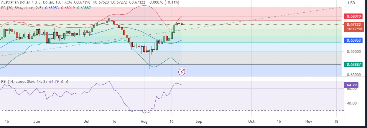 • Immediate resistance is located at 0.6763 (23.6%fib), any close above will push the pair towards 0.6793 (Higher BB).