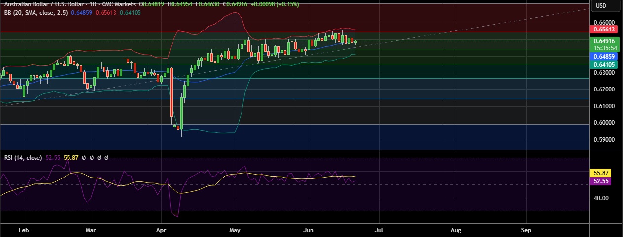 • Immediate resistance is located at 0.6546(23.6%fib), any close above will push the pair towards 0.6563(Higher BB).