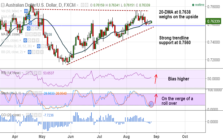 - AUD/USD trades 0.23 pct higher on the day, but upside in the pair finds stiff resistance by 20-DMA at 0.7638.