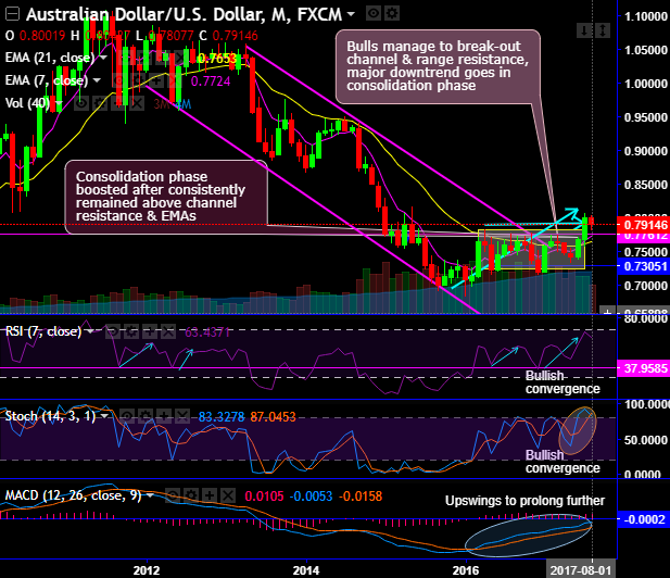Momentum indicators (on the daily chart) have been evidencing downward convergence that signals the strength in the bearish sentiments. But on monthly terms, it is signaling strength and momentum in the consolidation phase.