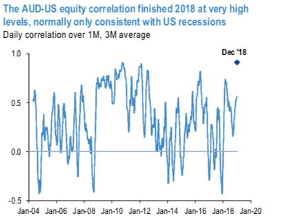 Positive terms of trade dynamics, therefore, anchor the longer-run FV metrics for AUD at relatively healthy levels. We expect the currency will trade at around a 10% discount to such estimates this year, driven by narrowing (more negative) rate spreads, and re-escalation of trade tensions. But meaningful depreciation beyond that seems to require a US/global recession: AUDUSD 1M correlation to US equities is already in the upper quartile or observations over the last 15 years (refer 1stchart). Through most of December, the correlation traded in the 90thpercentile.