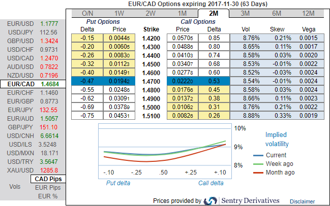 Mechanics: Buy EURCAD 2m ladder, strikes 1.4080/1.4678/1.4988 (we wouldn’t like to be precise about the indicative offer, certainly assured but slightly lower than vanilla structure, spot ref: 1.4678).