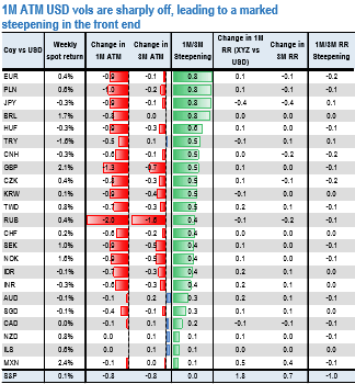While DXY vols have been easing consistently since US polls results, now in equity markets, a decent start to the Q4 earnings season is further helping vols flirt with all-time lows. At 8.5, 1M S&P vol is just a few decimal points above the abnormally low trough of Jun-Jul 2014. While the price action in FX vols doesn’t suggest the same level of complacency, this softness in front end vols is spilling over to 1M USD vols and sending them sharply lower across the board (refer table).