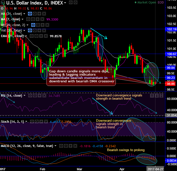 After gap down candle occurred at 98.79 level, the bears have managed to extend the price dips upto the current 98.86 levels (while articulating), yesterday’s rallies have exhausted exactly at 99.33 levels (refer daily chart).