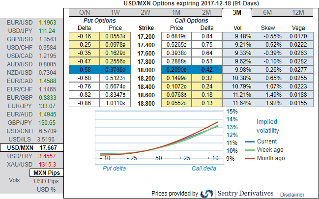 Please be noted that the 3m IVs of USDMXN are indicated bullish risks, the telling statistic from the graphic is that that the static carry of delta hedged vega-neutral 3M skews is a very substantial 2.5 vol pt., near the upper-end of its 2-yr range.