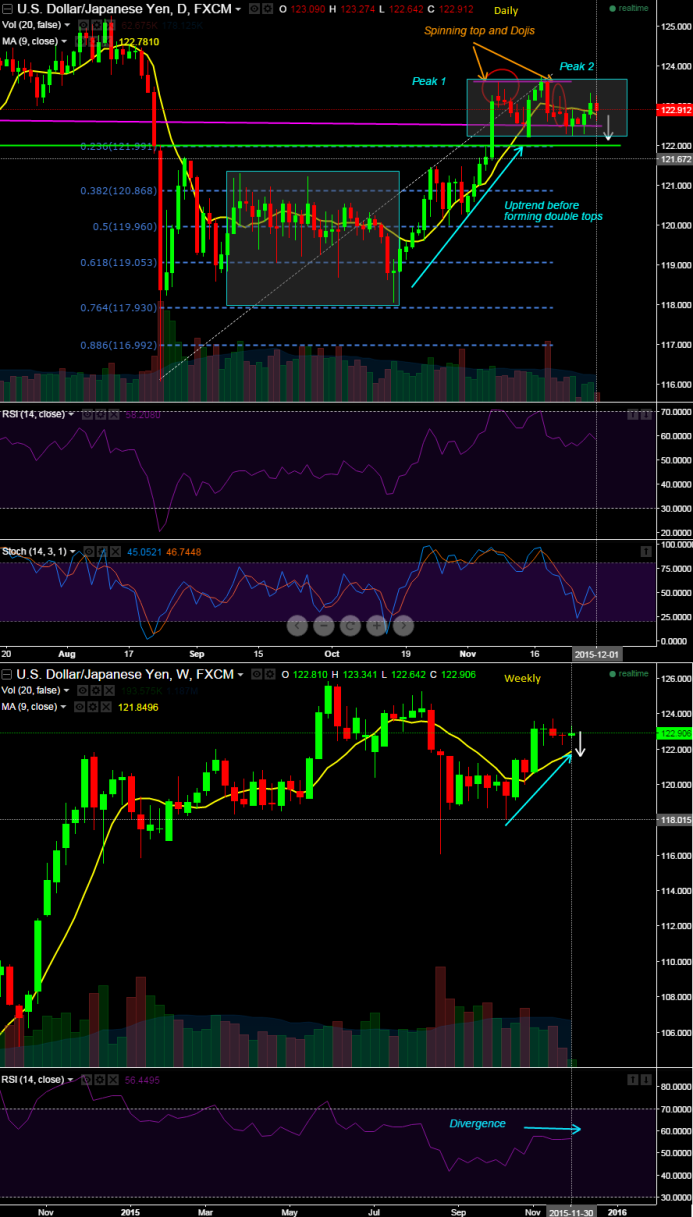 We see the trend going in tight range between 123.75- 122.22 from last fortnight or so which we perceive this as non directional but slightly downward bias since some bearish signals for short term are popping up. This has always been extremely tough & risky to have opened position in non-directional trend.